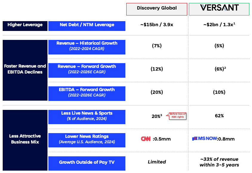 - There are several compelling reasons why Discovery Global should trade at a discount to Versant. First and foremost, Discovery Global will likely be significantly more leveraged. In addition, Discovery Global’s financial performance lags Versant on both a historical and projected basis, likely as a result of its less attractive portfolio, as detailed below: