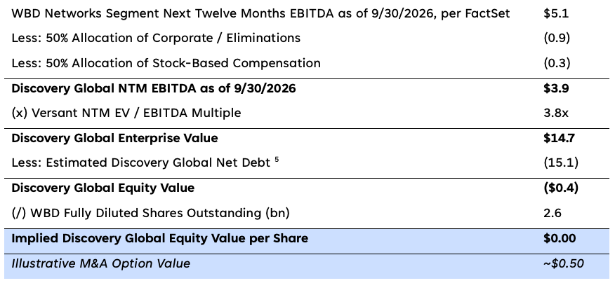 - Paramount’s analysis values Discovery Global at $0.00-0.50 per share. This assumes a forward EBITDA multiple of 3.8x, in-line with Versant’s trading multiple⁴ on January 7th, and $3.9 billion of next twelve months EBITDA for Discovery Global as of the estimated spin completion date (Q3 2026). This EBITDA is based on Wall Street consensus estimates and includes the allocation of 50% of WBD’s unallocated Corporate / Eliminations and stock-based compensation expenses. This assumption is based on the guidance provided by WBD CFO Gunnar Wiedenfels when WBD announced its separation, on June 9, that Discovery Global should account for approximately 50% of WBD’s consolidated corporate overhead expense; we have assumed the same applies for stock-based compensation. While this results in a fundamental value for Discovery Global of $0.00 per share, for illustrative purposes, we acknowledge the theoretical possibility that Discovery Global could trade with up to ~$0.50 per share of embedded M&A option value.